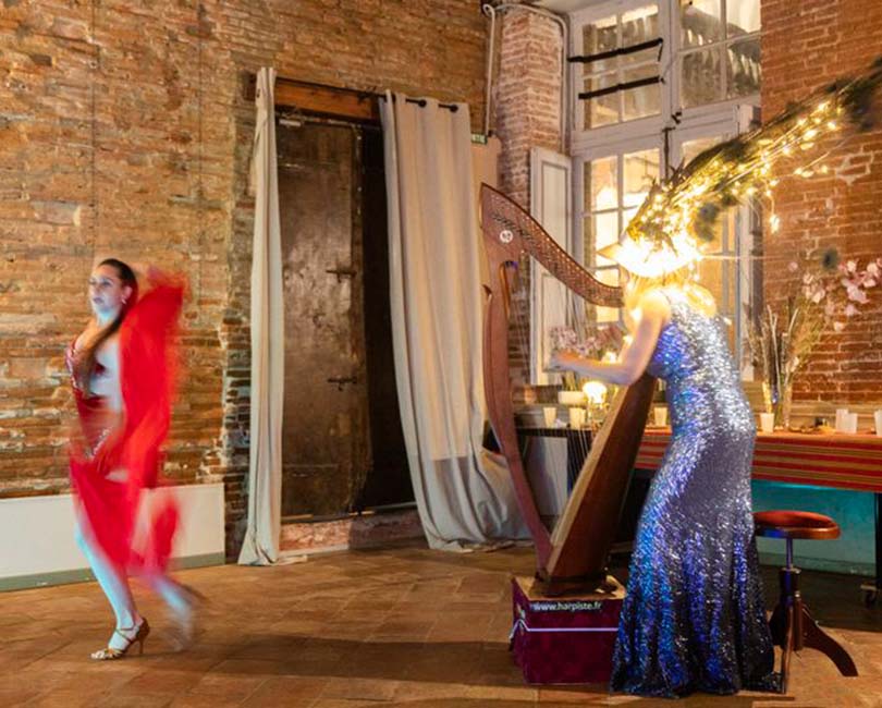 Accompagnée par la mystérieuse danseuse, Gabrielle fait résonner sa harpe avec une sensibilité unique, mêlant airs celtiques, classiques et modernes. Chaque note vibre dans cet écrin de pierre et de lumière, chaque mouvement de danse prolonge la mélodie, créant une harmonie envoûtante où la poésie prend vie sous vos yeux.