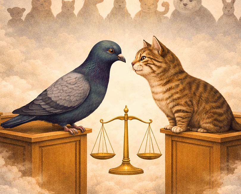 Quand un chat français et une pigeonne anglaise se rencontrent à Paris et deviennent amis, c’est tout le rapport entre proies et prédateurs qui est bouleversé. Ils sont rapidement arrêtés pour trouble à l’ordre naturel. L’affaire est portée devant les tribunaux où Gigi, une petite fille au caractère bien trempé, sera l’avocate de la défense. Coupables ou innocents ? La question s’envenime quand les végétaux et les forces célestes s’en mêlent...