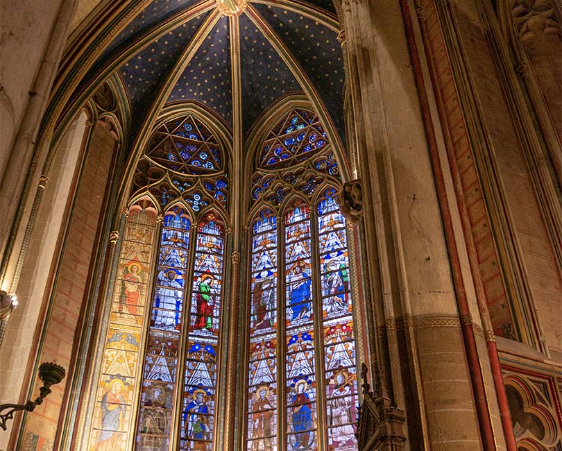Using the stained glass windows of Saint-Etienne's Cathedral as a starting point, learn how to look at a stained glass window by exploring the history of techniques and the development of the art of stained glass from the 18th to the 20th century.