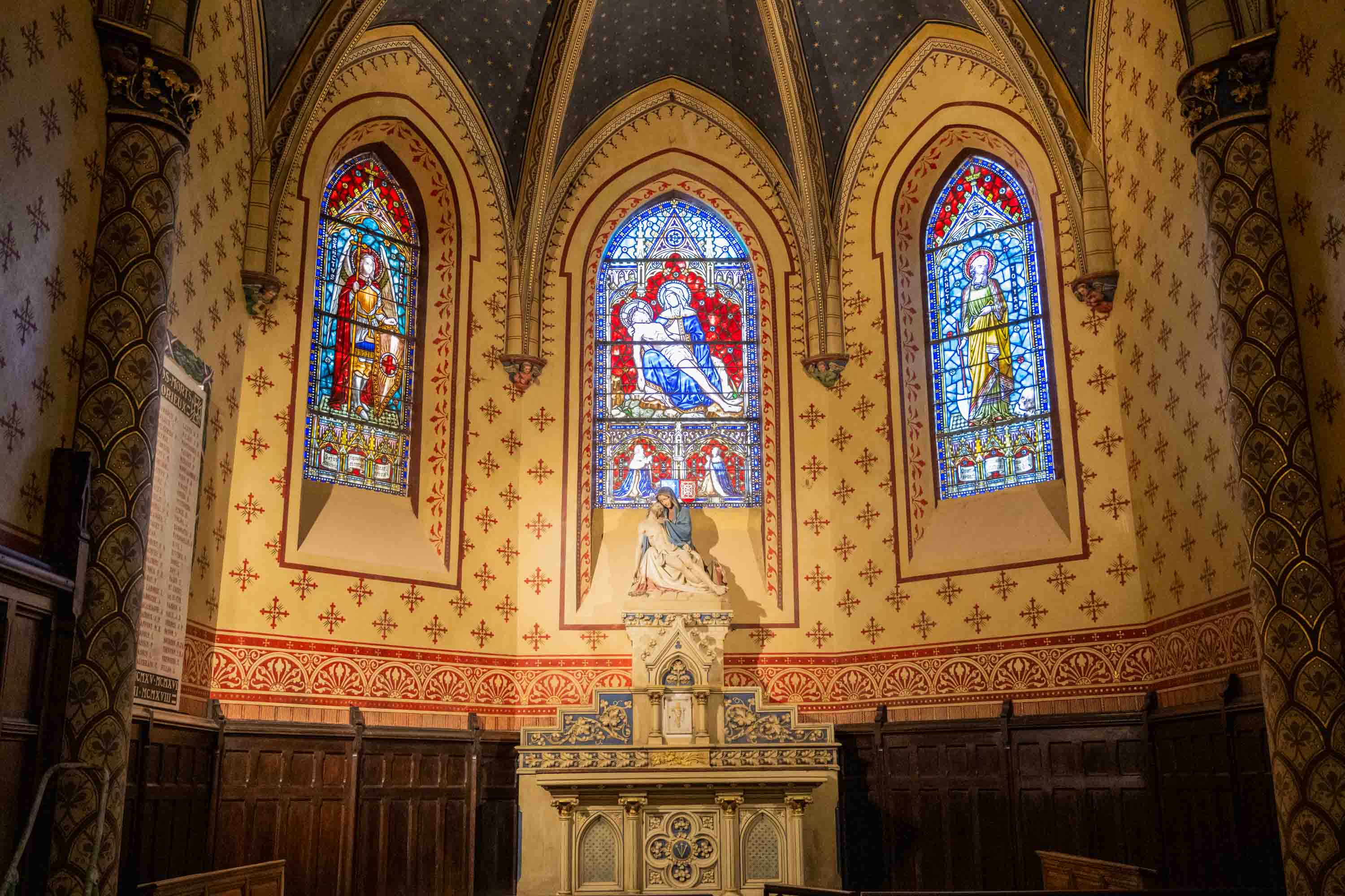 La historia del martirio se ve plasmada en el gran fresco dorado que está encima del altar mayor. La iglesia es muy austera. Venera una Virgen Negra, Notre-Dame du Rempart, que está vestida de brocado.